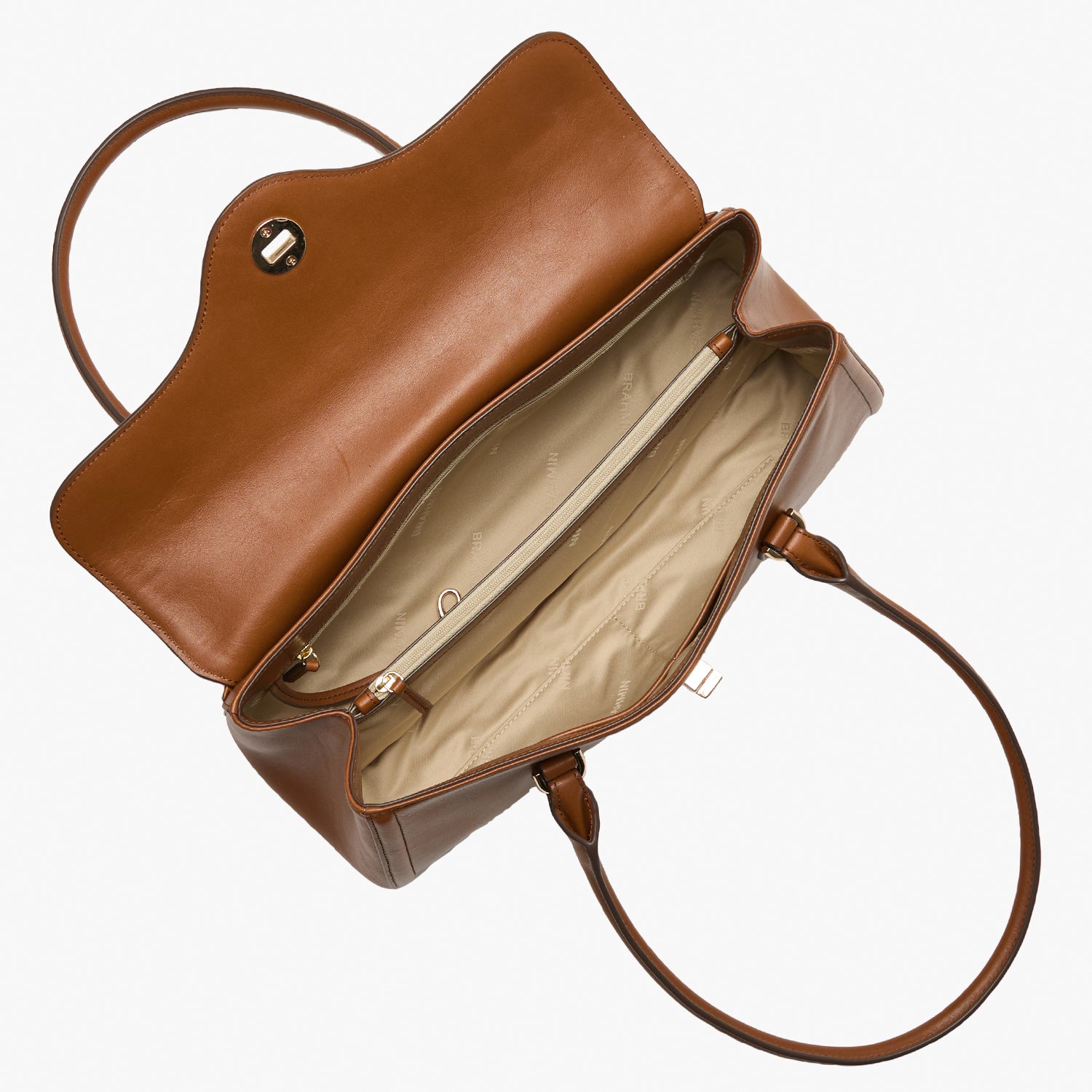 This satchel started with inspiration from a vintage Brahmin bag. We added fresh, modern twists and functional details like the turn lock closure, a back slide in pocket, and rolled handles. The bottom feet offer protection and ease.