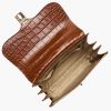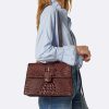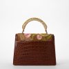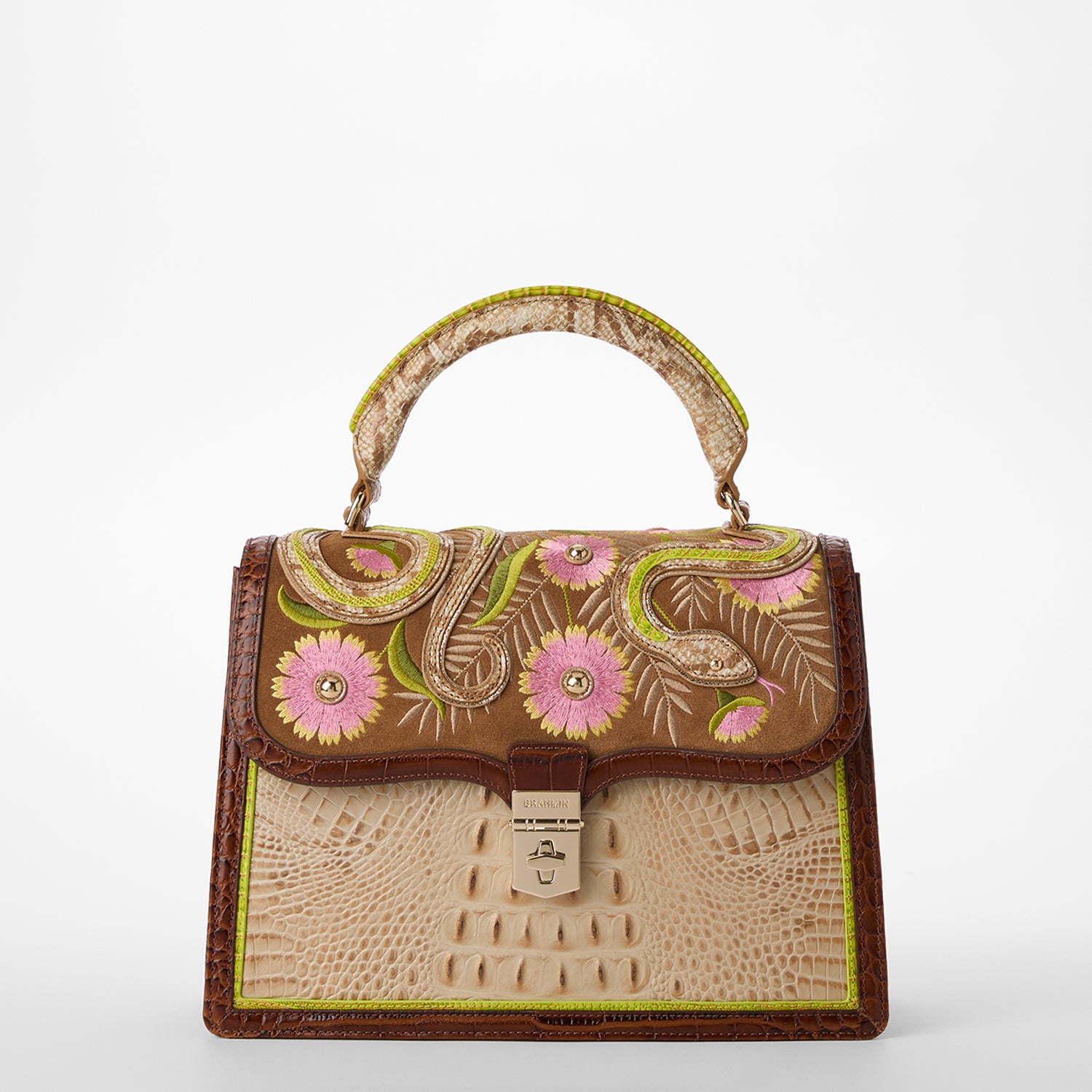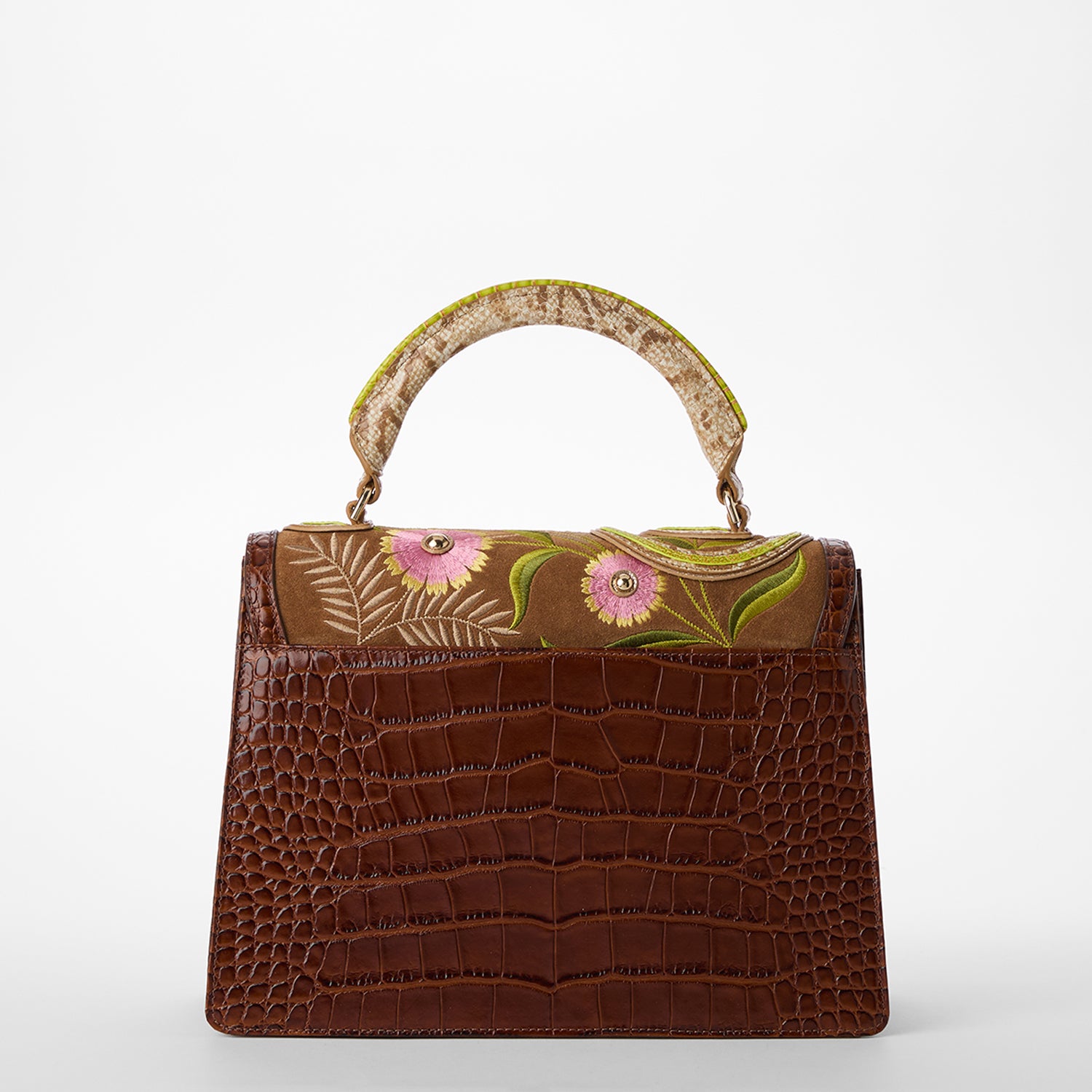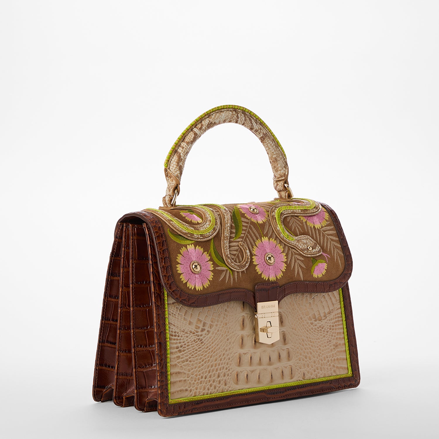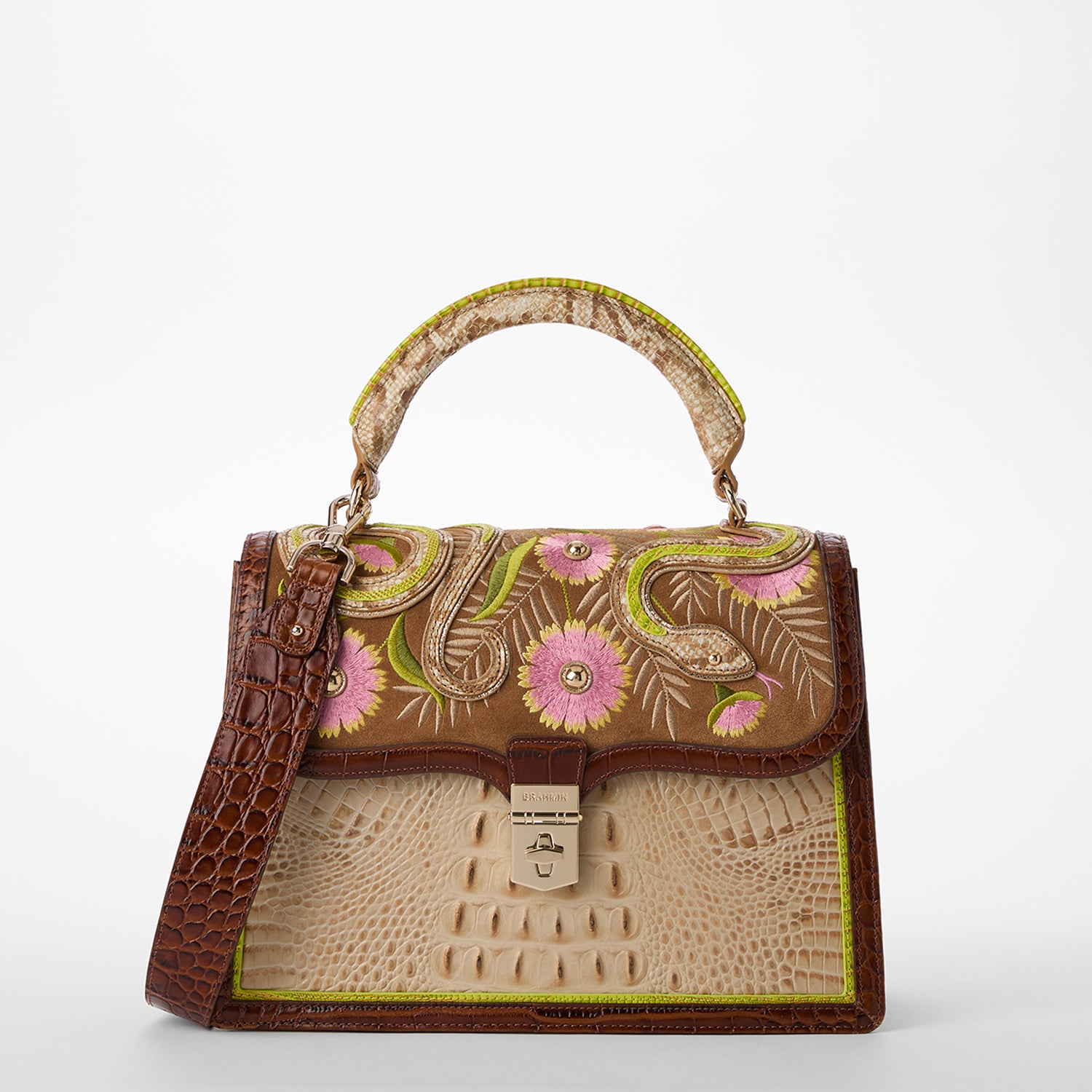 Featured in Sandstorm Yuma, a pinnacle of artistry and craftmanship. Exotic textured leathers get brought to life with colorful custom embroidery. Our luxurious flat croc in a warm chestnut accents our softer approach to classic Melbourne, Sandstorm Alden Road. Applique embroidery depicts a snake twining through flowers and foliage as a nod to classic Americana. Made with genuine leather.