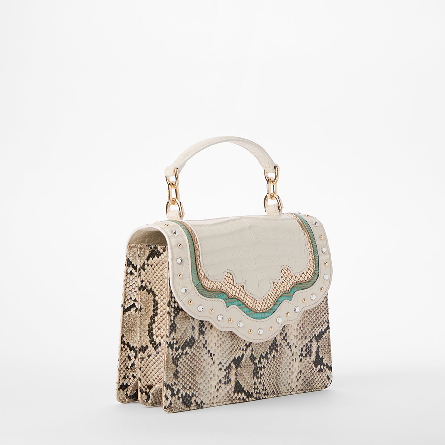 Featured in Cloud Dancer Dubois, a fresh blend of texture and color. An Americana-inspired collection that brings together a white flat croc with neutral beige snake print, gold metallic, and a pop of turquoise lizard. The curved applique and cutouts are an elevated twist on Western. Stud and Swarovski® crystal accents give this luxe appeal. Made with genuine leather.