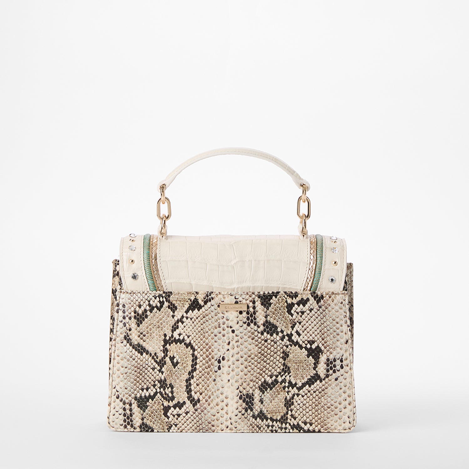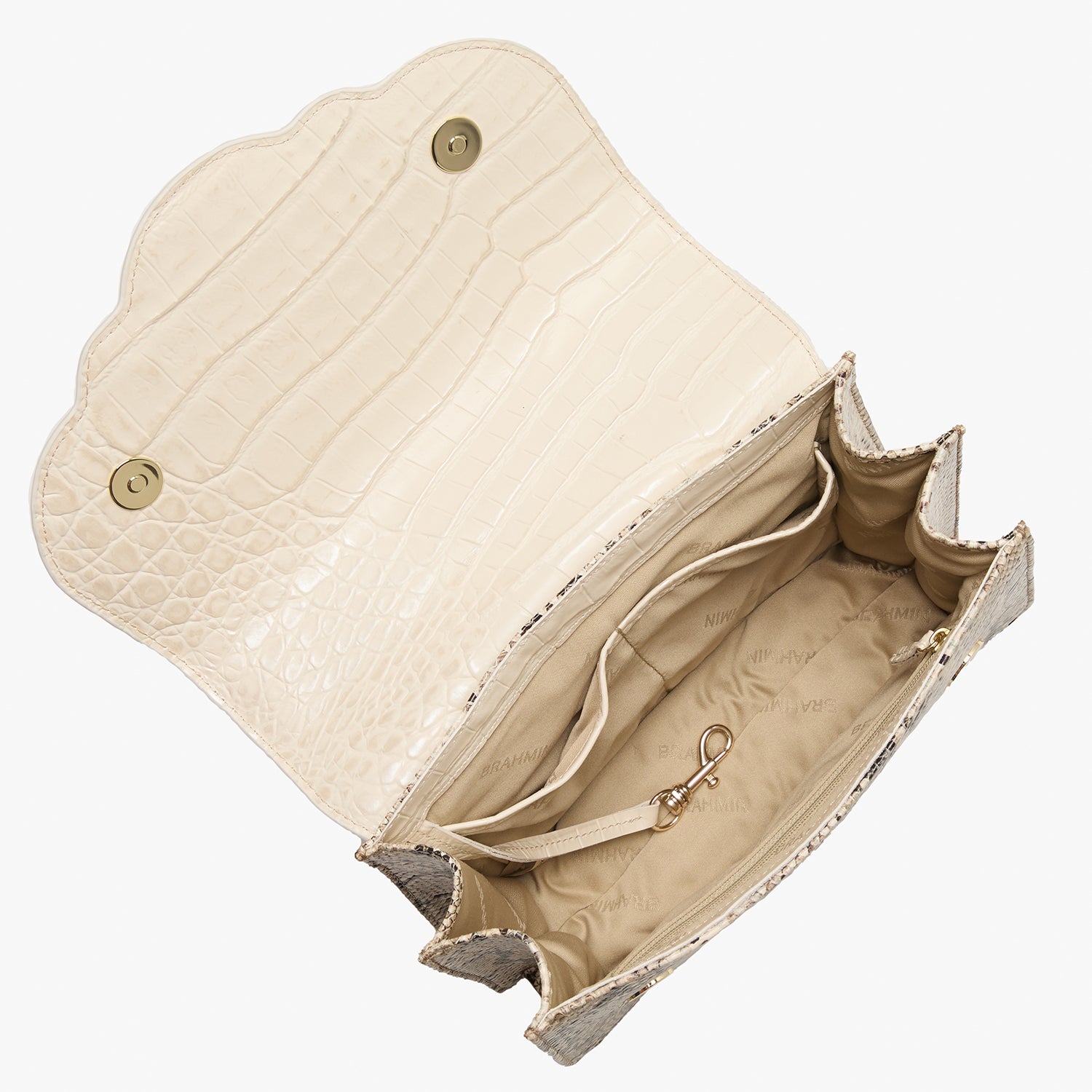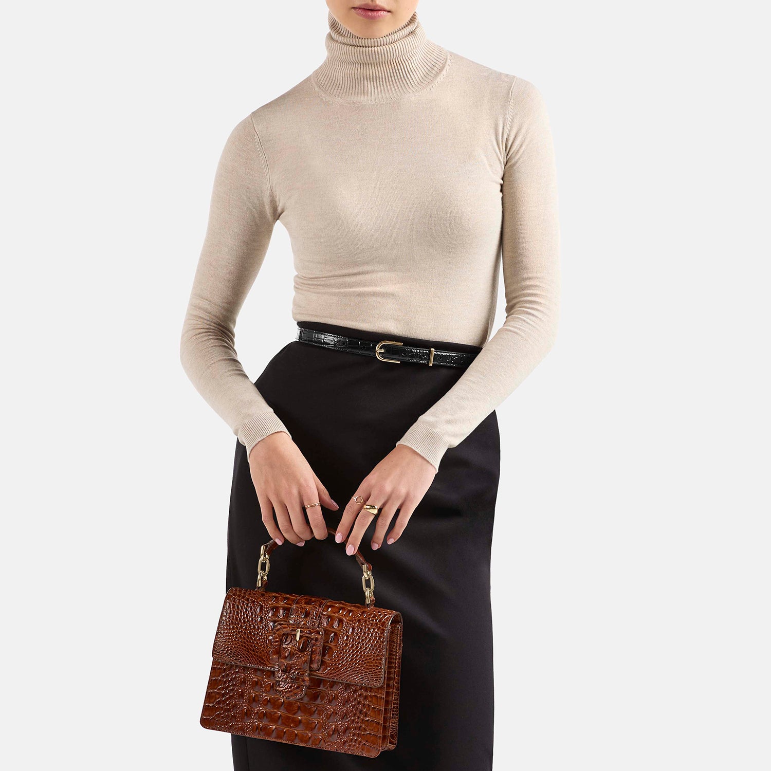 Small Hallie is a more compact version of our best-selling Hallie satchel. This ultra-chic silhouette features a flap turn lock closure for elevated ease. The extendable sides allow for easy opening and access to your essentials. The back slide in pocket is the perfect place for your phone or credit cards for quick transactions.