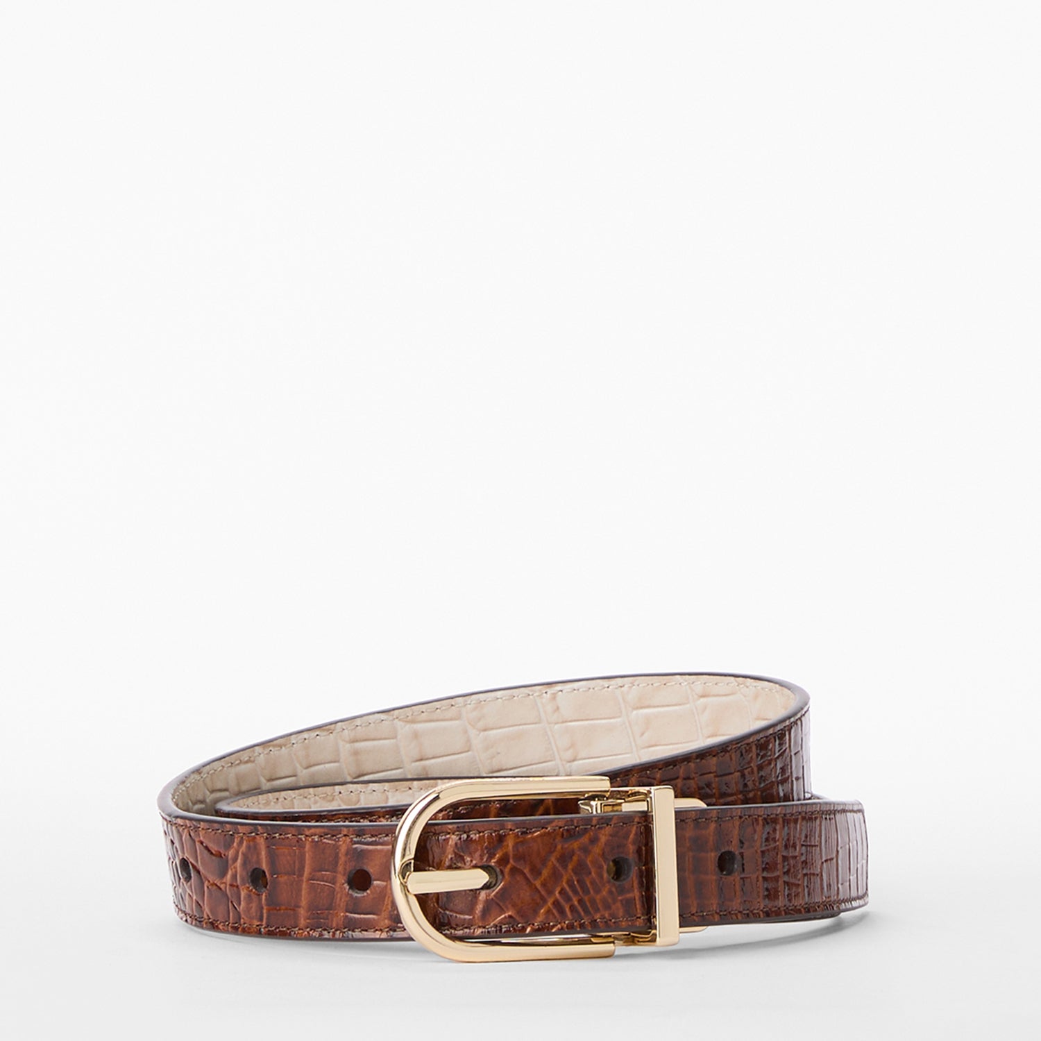 Featured in Contour Classic Croc Belt, a reversible accessory that gives you style flexibility. Two classics, one style. This belt features warm Chestnut Melbourne leather on one side and cool Contour on the reverse. The metal belt buckle easily rotates from one side to the other for a smooth transition. Brahmin branding is visible on both sides of the buckle for an added element of luxury. Made with genuine leather.