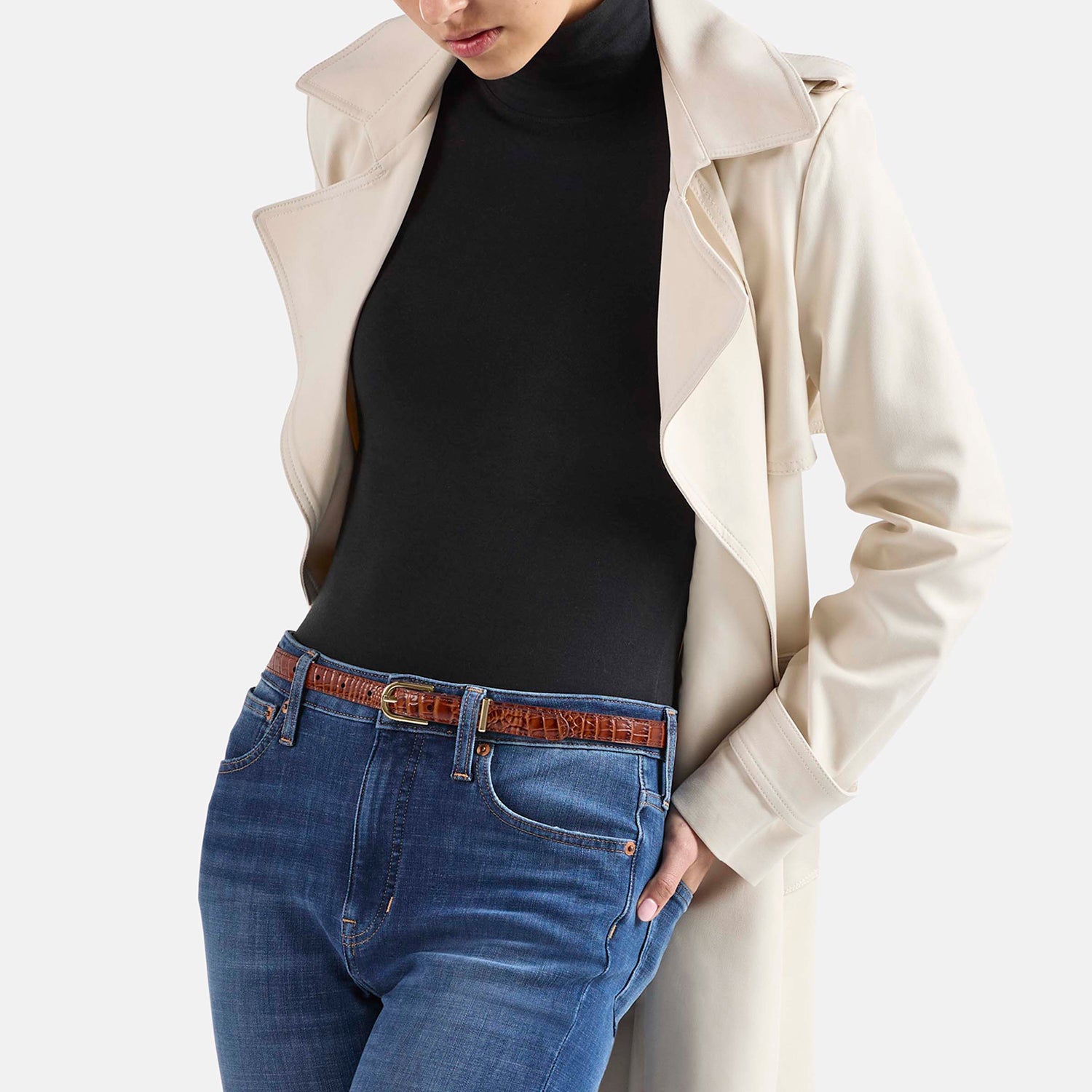The Skinny Leather Gold Buckle Belt is designed to add an elevated accent to any ensemble. The thinner width belt brings just a hint of color to your look. The embossed logo design is a Brahmin signature. Made with genuine leather.